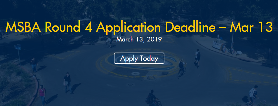 MSBA PROGRAM The Round 4 Application Deadline for the Fall 2019 entering class is March 13, 2019. If you experience any complications during the application process, don’t hesitate to reach out to our admissions experts for help. Contact the admissions office or attend one of our upcoming events to obtain the advice you need to insure your spot in the incoming Fall 2019 class.